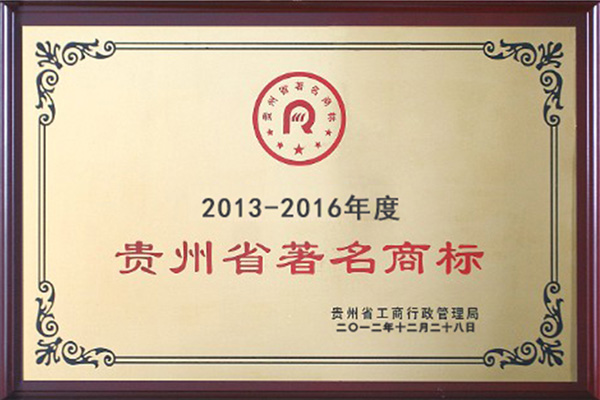 2012年12月28日,我公司榮獲了由貴州省工商行政管理局頒發(fā)的“2013—2016年度貴州省著名商標(biāo)”稱號。