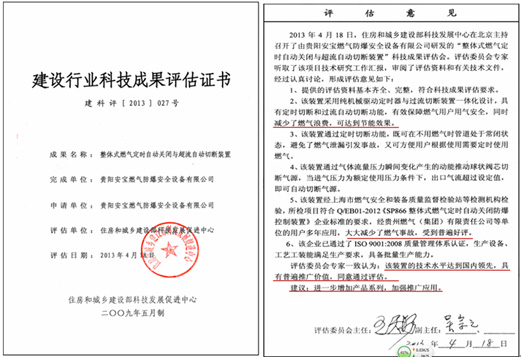 2013年4月18日,建設(shè)行業(yè)科技成果評(píng)估會(huì)在北京順利召開。會(huì)議由城鄉(xiāng)建設(shè)部科技發(fā)展中心高立新處長(zhǎng)主持,評(píng)估委員會(huì)由中國(guó)城市燃?xì)鈪f(xié)會(huì)理事長(zhǎng)王天錫擔(dān)任主任委員、中國(guó)安全生產(chǎn)科學(xué)研究院院長(zhǎng)吳宗之擔(dān)任副主任委員,及來自國(guó)家燃?xì)庥镁哔|(zhì)量監(jiān)督檢測(cè)中心、中國(guó)城市建設(shè)研究院、北京市計(jì)量檢測(cè)科學(xué)研究所、北京市燃?xì)饧瘓F(tuán)有限公司、北京市公用工程設(shè)計(jì)監(jiān)理公司、新奧集團(tuán)股份有限公司的專家委員組成。對(duì)貴陽安寶燃?xì)夥辣踩O(shè)備有限公司研發(fā)的“整體式燃?xì)舛〞r(shí)自動(dòng)關(guān)閉與超流自動(dòng)切斷裝置”進(jìn)行了科技成果評(píng)估。