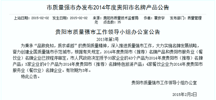 2015年2月2日,貴陽(yáng)市質(zhì)量強(qiáng)市工作領(lǐng)導(dǎo)小組辦公室正式授予我公司相關(guān)設(shè)備為2014年度貴陽(yáng)市(推薦)名牌產(chǎn)品。